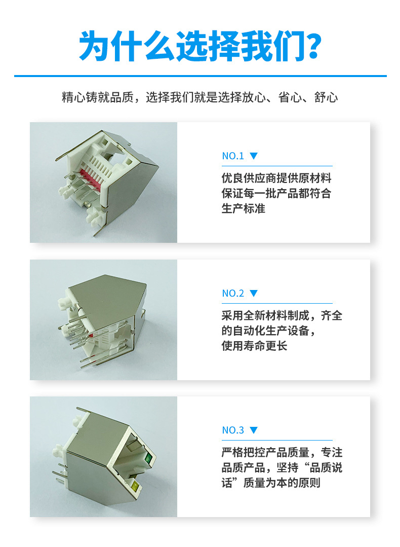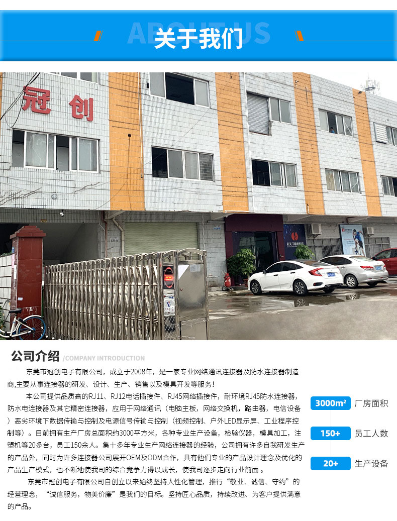 本公司提供優良的RJ11、RJ12電話插接件、RJ45網絡插接件,耐環境RJ45防水連接器,防水電連接器及其它精密連接器,產品應用于網絡通訊(電腦主板,網絡交換機,路由器,電信設備)、惡劣環境下數據傳輸與控制及電源信號傳輸與控制(戶外LED顯示屏、機器控制、工業程序控制等)